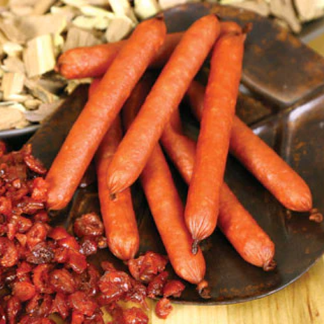 INGREDIENTS: PORK, CHICKEN, CHERRY SYRUP [HIGH FRUCTOSE CORN SYRUP, WATER, NATRUAL AND ARTIFICIAL CHERRY FLAVOR, CITRIC ACID, SODIUM BENZOATE (PRESERVATIVE), SODIUM CITRATE, FD&C RED 40 AND FD&C BLUE 1)], MAPLE SUGAR FLAVOR [SUGAR, MAPLE FLAVOR (CARAMEL COLOR AND NATURAL FLAVOR), MAPLE SUGARI, SALT, LESS THAN 2%: CULTURED DEXTROSE, CULTURED CELERY POWDER, SEA SALT. ENCAPSULATED CITRIC ACID, ONION,. GARLIC, SPICES. STUFFED INTO BEEF COLLAGEN CASING FD8C RED 3.