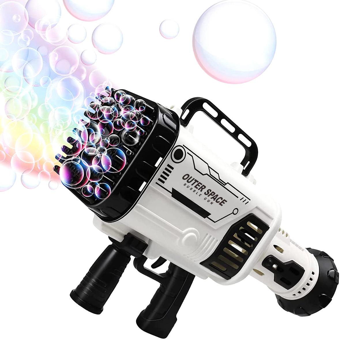 Introducing our dazzling Outer Space Bubble Blaster, a delightful addition to any playtime adventure! With an impressive 80-hole design, it unleashes a mesmerizing flurry of bubbles in vibrant colors, creating an enchanting spectacle. But the magic doesn't stop there – built-in lighting effects add an extra dimension of wonder to the bubbly extravaganza. Plus, with a convenient built-in battery, the fun never has to pause. Get ready to ignite imaginations and spread joy with our Bubble Blaster!